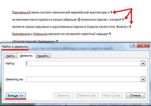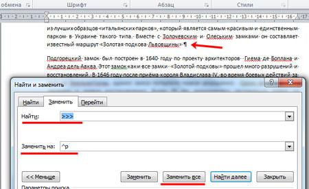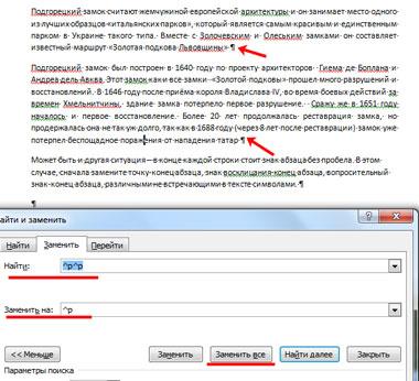 В поле «Найти» введите символ, после которого следует абзац. Например, если каждая строка в документе заканчивается символом «;», введите этот символ в поле «Найти».